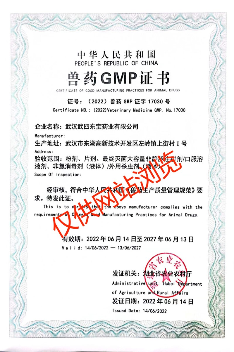 武漢武四東寶藥業有限公司,是在原武昌獸藥廠(成立于1972年)基礎上發展而來,公司位于武漢市東湖新技術開發區左嶺工業園,是一家專業從事動物保健品的研發、生產、銷售和服務于一體的高新技術企業,目前擁有六條生產線、十種劑型(最終滅菌小容量注射劑、最終滅菌大容量非靜脈注射劑、口服溶液劑、粉劑、預混劑、固體殺蟲劑、液體殺蟲劑、片劑、顆粒劑、液體消毒劑)。公司成立于2004年,2006年全面通過國家農業部獸藥GMP認證,已成為中國獸用保健行業知名企業之一。武漢武四東寶藥業有限公司自創建以來,一直秉承著“善、行、學、成”的核心價值觀,恪守“一切為了健康養殖”的企業使命,堅持“科技成就價值,服務創造未來”的服務理念,經過多年不斷的創新與發展,逐步形成了自己的核心競爭力,并在行業中脫穎而出。公司與中國農業大學、華中農業大學、武漢工程大學、武漢工業學院、中科院水生所等全國知名院校和科研院所建立了長期密切的合作關系,通過聯合攻關和技術引進等方式,研發出50多種優質、高效、穩定的產品,并深得廣大用戶的認可與信賴。公司以“追求健康的用戶群體和卓越市場占有率”為經營理念,堅持以市場為導向,強化科技創新,拓展產品結構,努力為我國健康養殖事業的發展作出更大的貢獻!